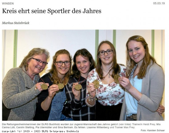 Anfang des Jahres erreichte uns die Meldung, das die Sportler der DLRG Buchholz, bei der Sportlerehrung des Kreissportbundes Harburg mit einer Ehrung für ihre erneuten tollen Ergebnisse bei den Deutschen Meisterschaften 2018 bedacht werden. Geehrt wurden: Einzel - Tobias Stelting (AK12 m) für seinen 5. Platz bei seinen zweiten Deutschen Meisterschaften. Mannschaft - Sina Bertram, Lisanne Wittenberg, Pia Utermüller, Mia Carina Lüß, Carolin Stelting (AK17/18 w) für ihre erneute Top 10 Plazierung - im letzten Jahr Platz 8 auf den Deutschen Meisterschaften. und als Trainer - Max Frey Der Vorstand der Ortsgruppe Buchholz gratuliert ganz herzlich zu diesen Auszeichnungen und wünscht weiterhin tolle ... Mehr erfahren